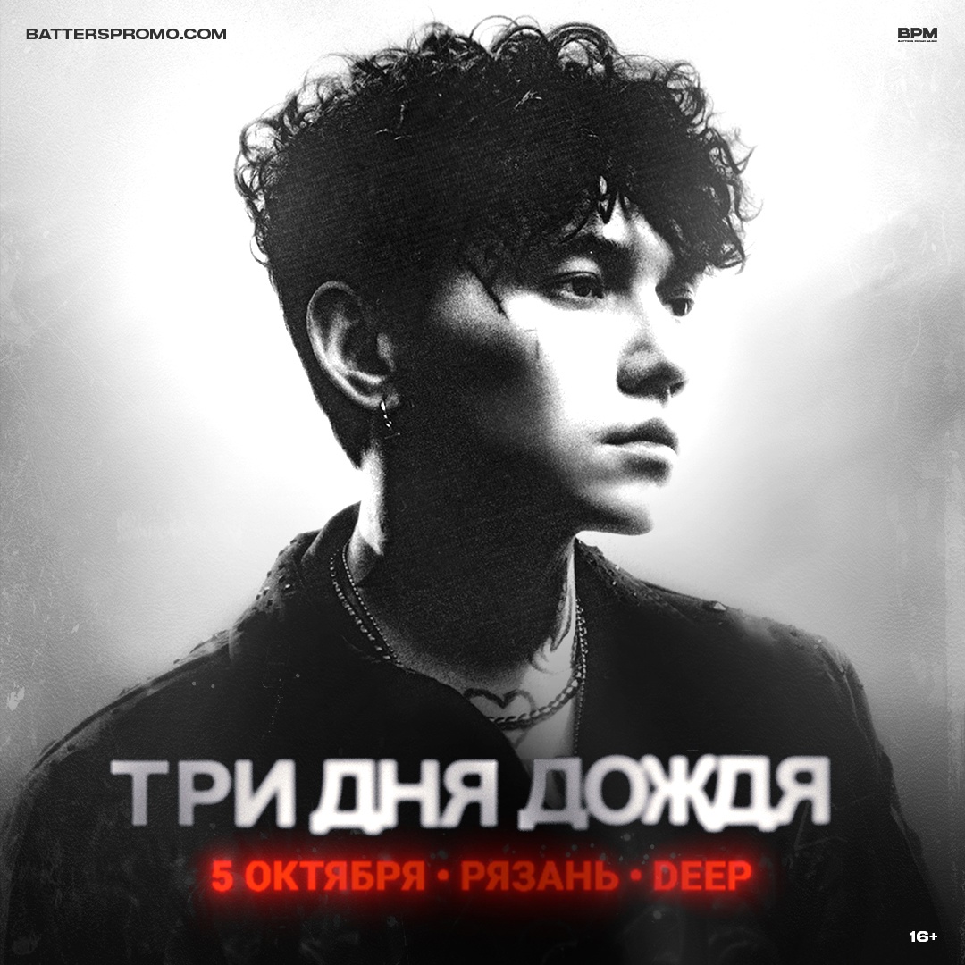 5 октября 2025 года на сцене Deep Club города Рязани состоится концерт музыкального проекта «Три дня дождя». Приходи оторваться под самые запоминающиеся треки и самые искренние строки!