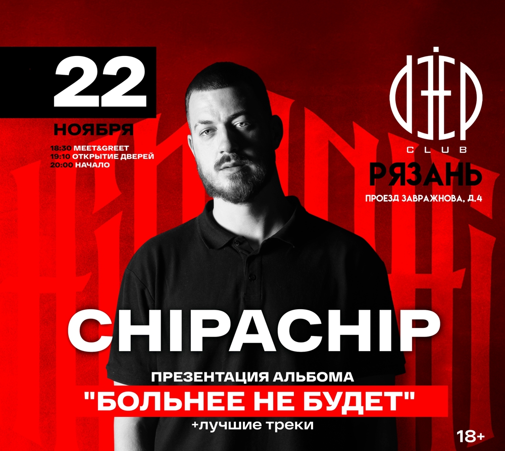 22 ноября 2025 года на сцене Deep club города Рязани состоится концерт рэп-исполнителя ChipaChip. Вас ждут: все хиты и презентация нового материала! Не пропустите!